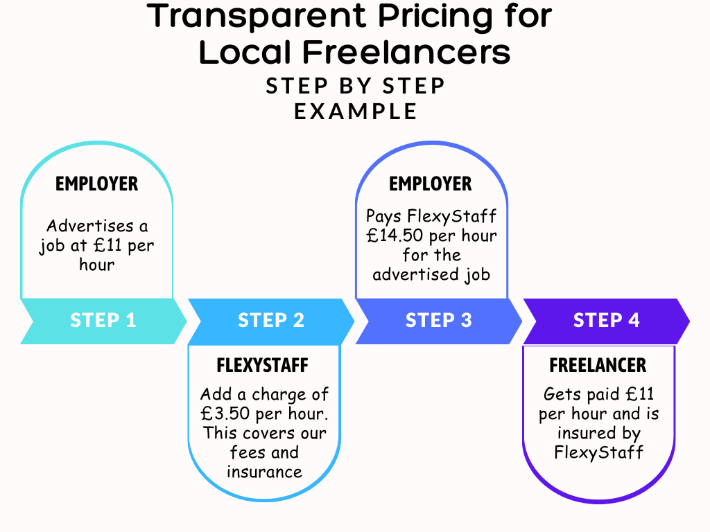 Our costs are fully transparent. The employer sets the hourly rate that they wish to pay the freelancer. Flexystaff’s competitive set fees of £3.50 per hour are then applied and paid for by the employer before the job is posted. The employer will pay the total fee and we take care of the rest. The freelancer will be paid the hourly rate advertised, Flexystaff take their fee and insure the freelancer to work the shift advertised, the job is completed, and the freelancer is paid within 7 days.